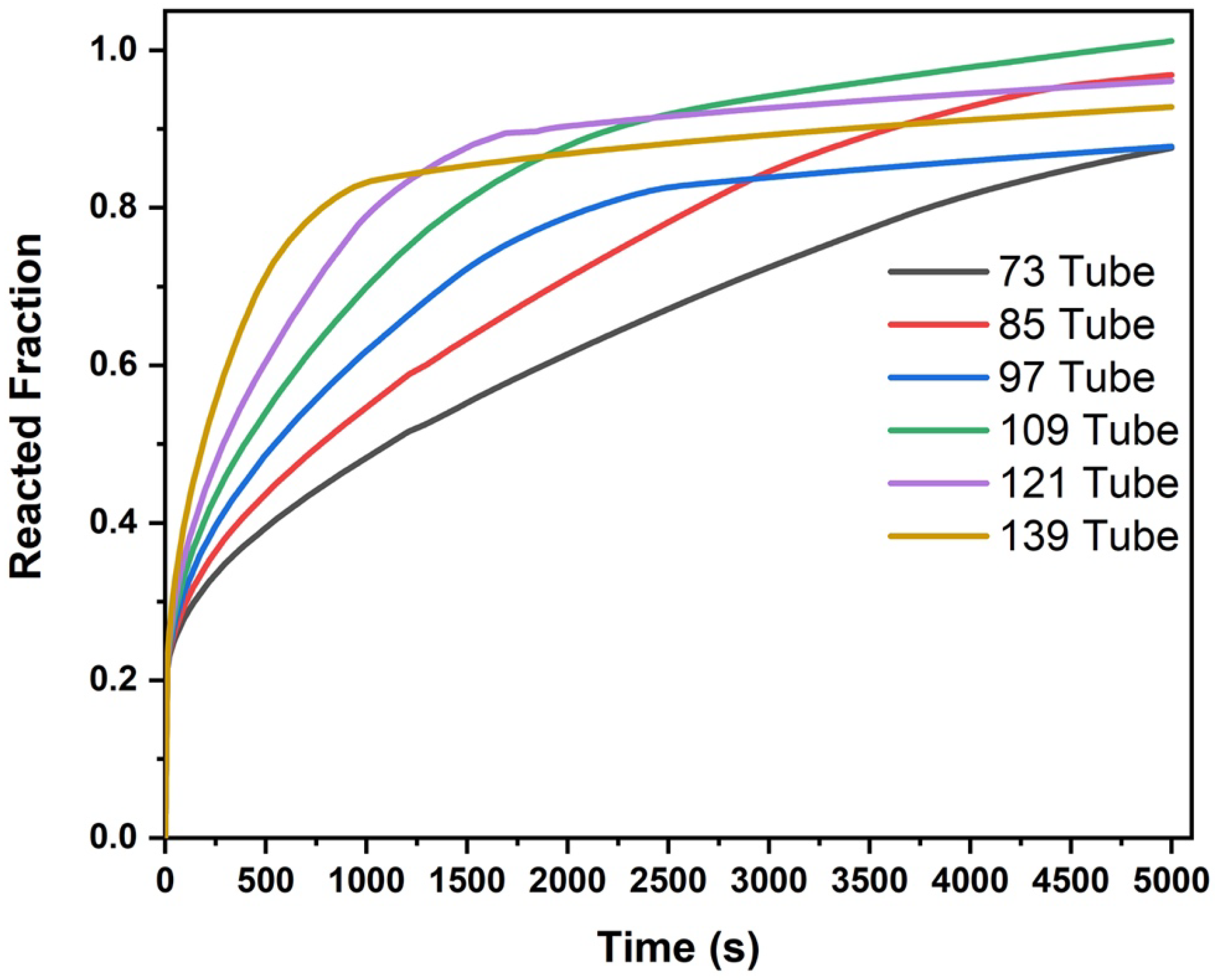 Figure 1 shows the reacted fraction for each tube configuration. Increasing the number of tubes initially results in a faster rate of reaction as expected, but as previously mentioned, the tube spacing and diameter must be optimized for 90% of the reaction to be completed. When the metal hydride bed is not evenly cooled, the reaction rate significantly decreases after reaching 80%. This effect is evident in