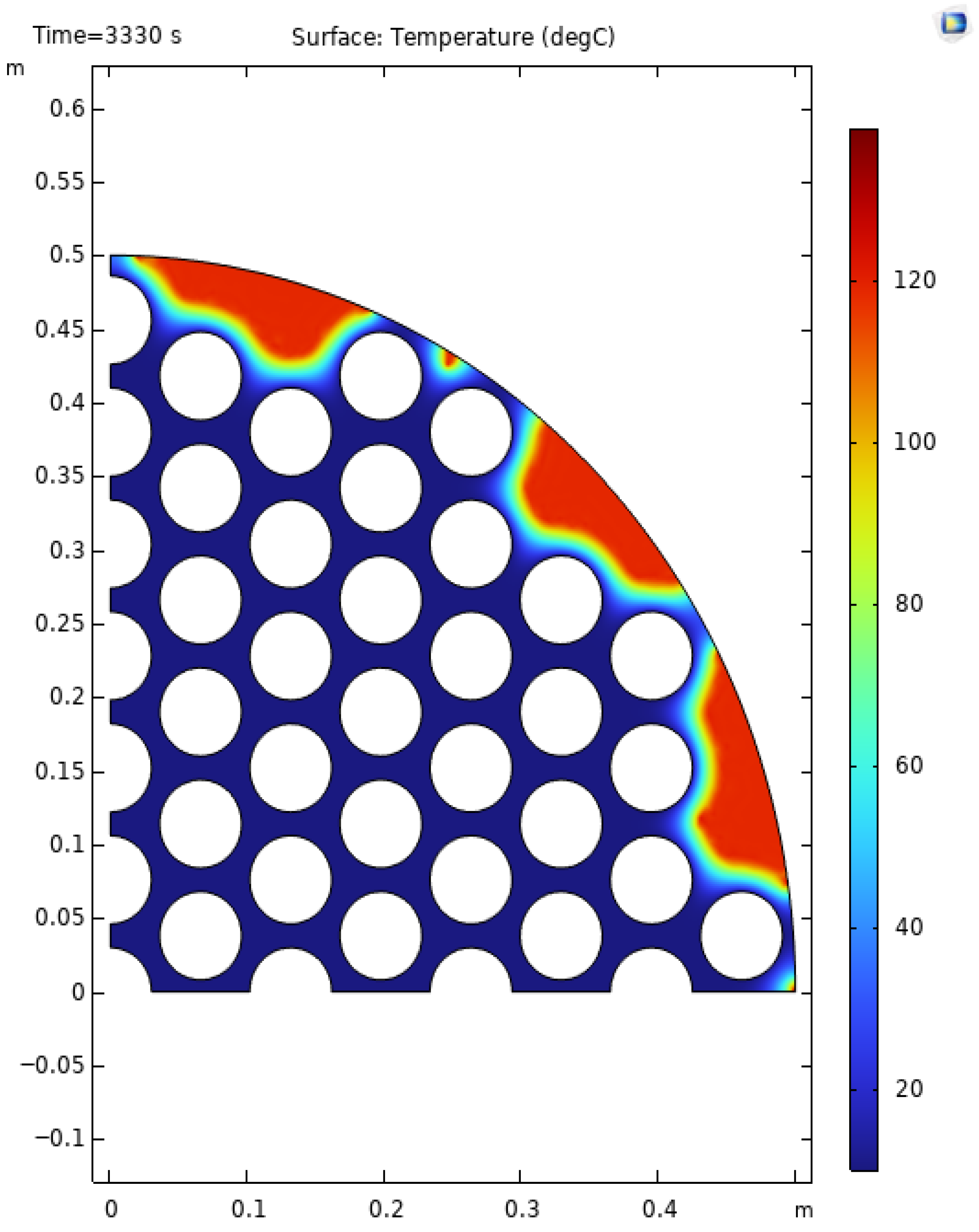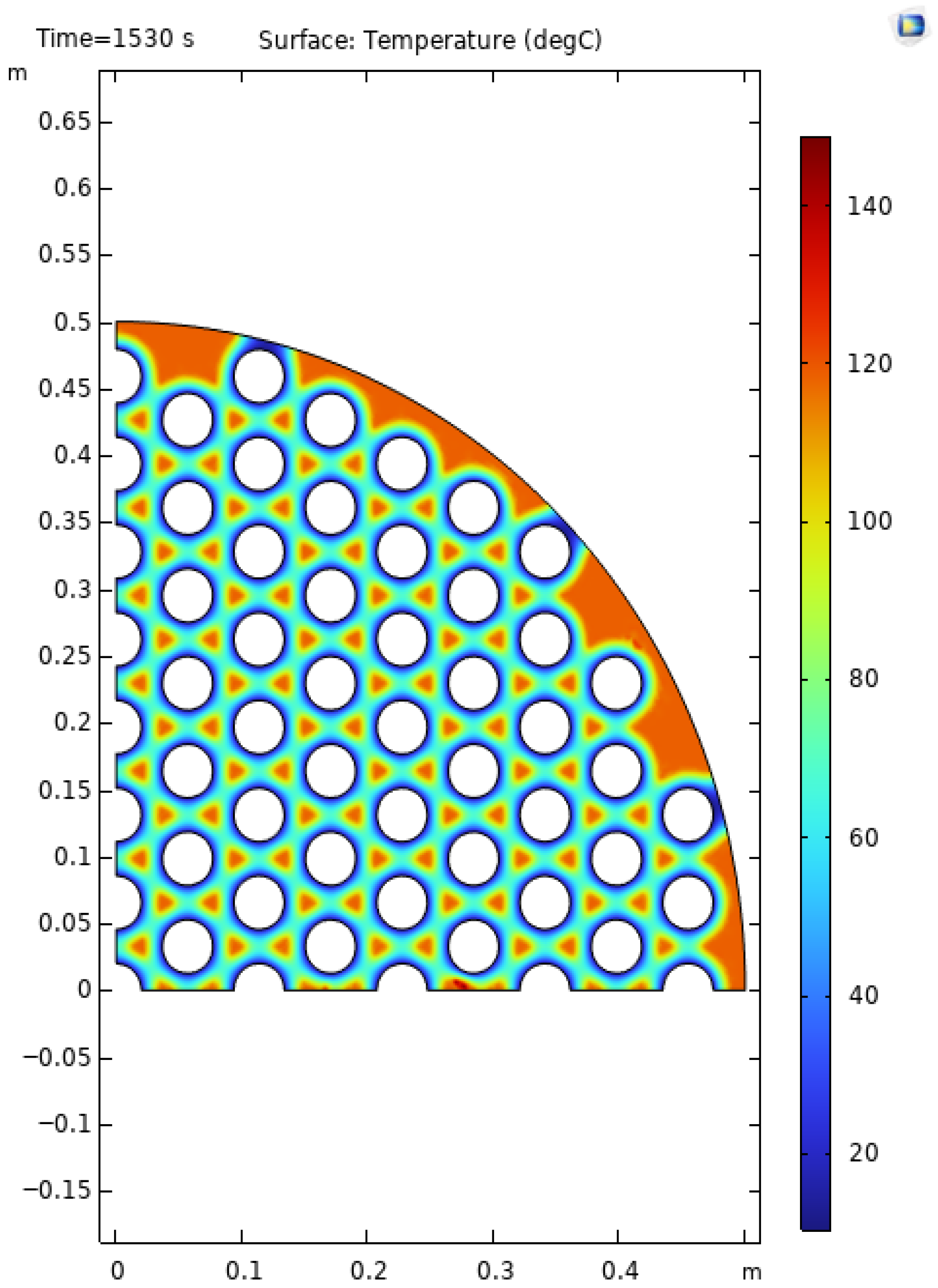 When creating the reactor geometry in COMSOL, one-quarter of the total reactor was utilized. Since each quarter is identical, simulating one section should yield results equivalent to modeling the complete reactor, while significantly reducing computational time [