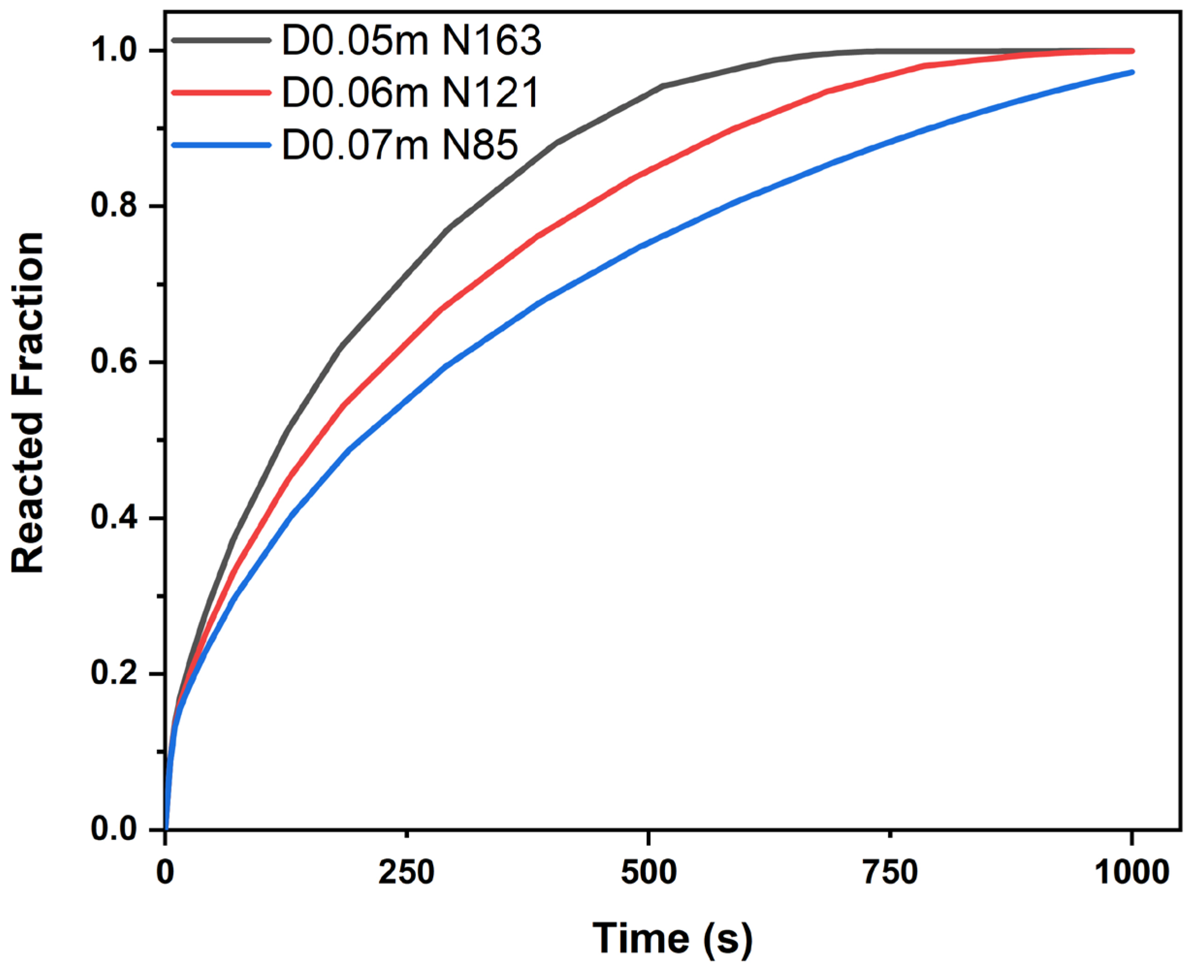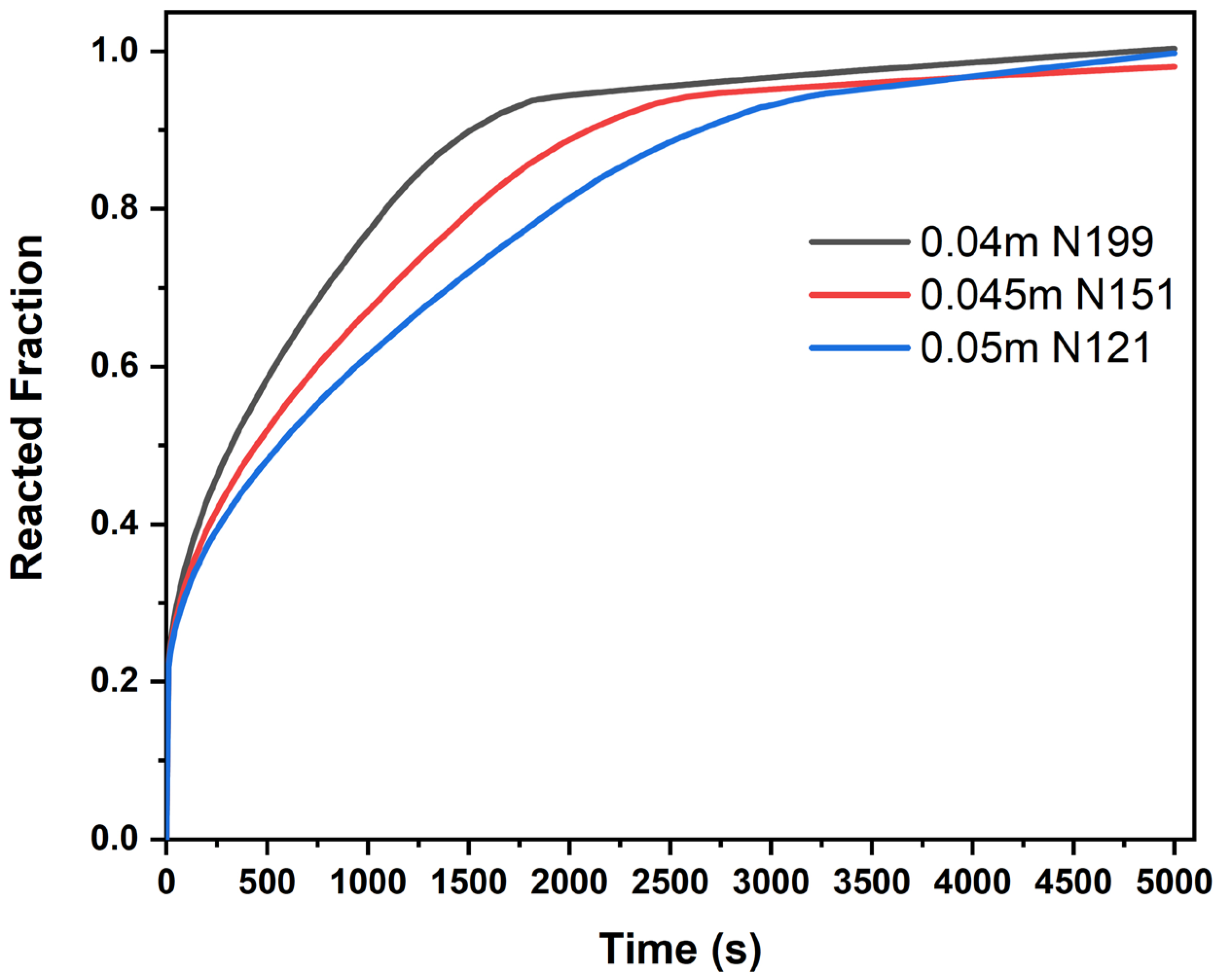n = 97) could not reach a 90% reacted fraction within the 5000 s heat transfer simulation. Although reactor 3 incorporated a larger volume for cooling, it exhibited a poorer cooling performance due to the formation of hotspots around its outer region.
