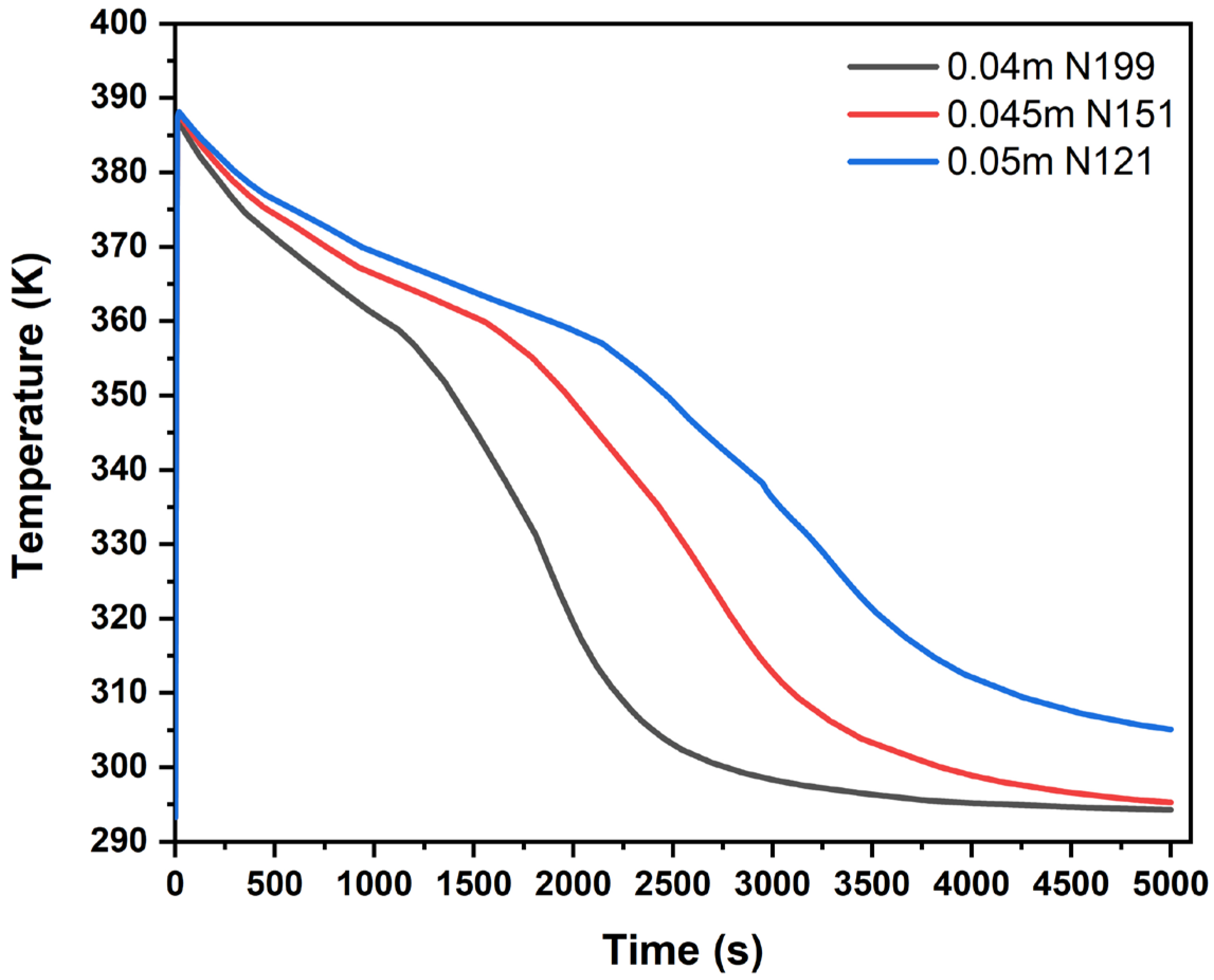 To ensure numerical accuracy, a grid independence study was conducted by systematically refining the computational mesh using COMSOL’s predefined element size sequences. Different mesh levels were examined, and the transient solution was evaluated at t = 3000 s using the hotspot temperature difference (ΔT = Thotspot − Tinitial) as a representative metric. The adopted mesh yielded ΔT = 40.33 K, while the immediately coarser mesh produced ΔT = 40.23 K, corresponding to a relative difference of approximately 0.25%. Further mesh refinement resulted in negligible changes relative to the additional computational cost. Based on this convergence behavior, the selected mesh was deemed grid-independent and was used for all subsequent simulations.