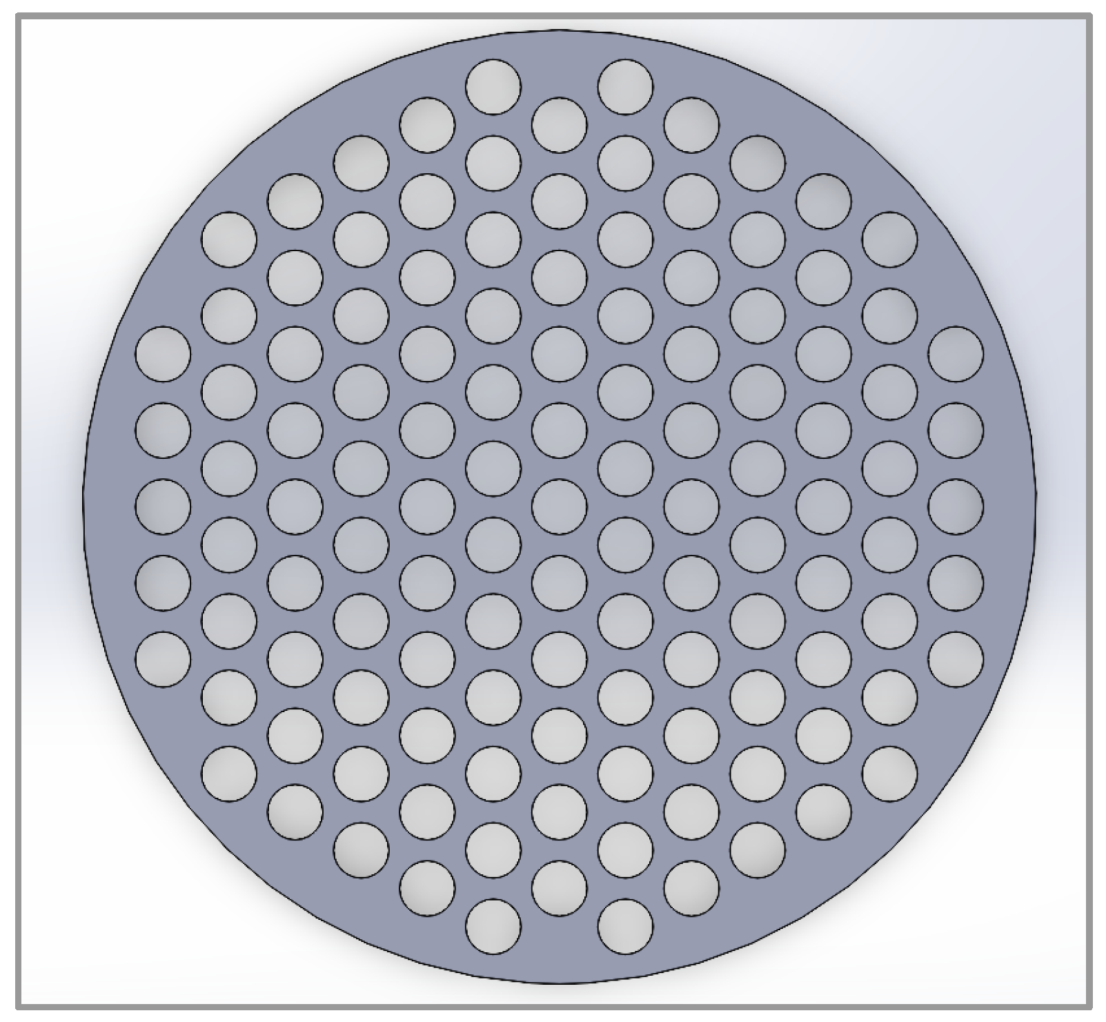 31]. The model was designed to allow easy modifications of variables for testing multiple reactors. In this article, the variables that will be varied are the inner tube diameter and the tube spacing. The geometry for each reactor was initially sketched in SolidWorks 2023 and then imported into COMSOL. This made testing different reactors efficient as the software provided capability to design tube bundles with a triangular pitch (