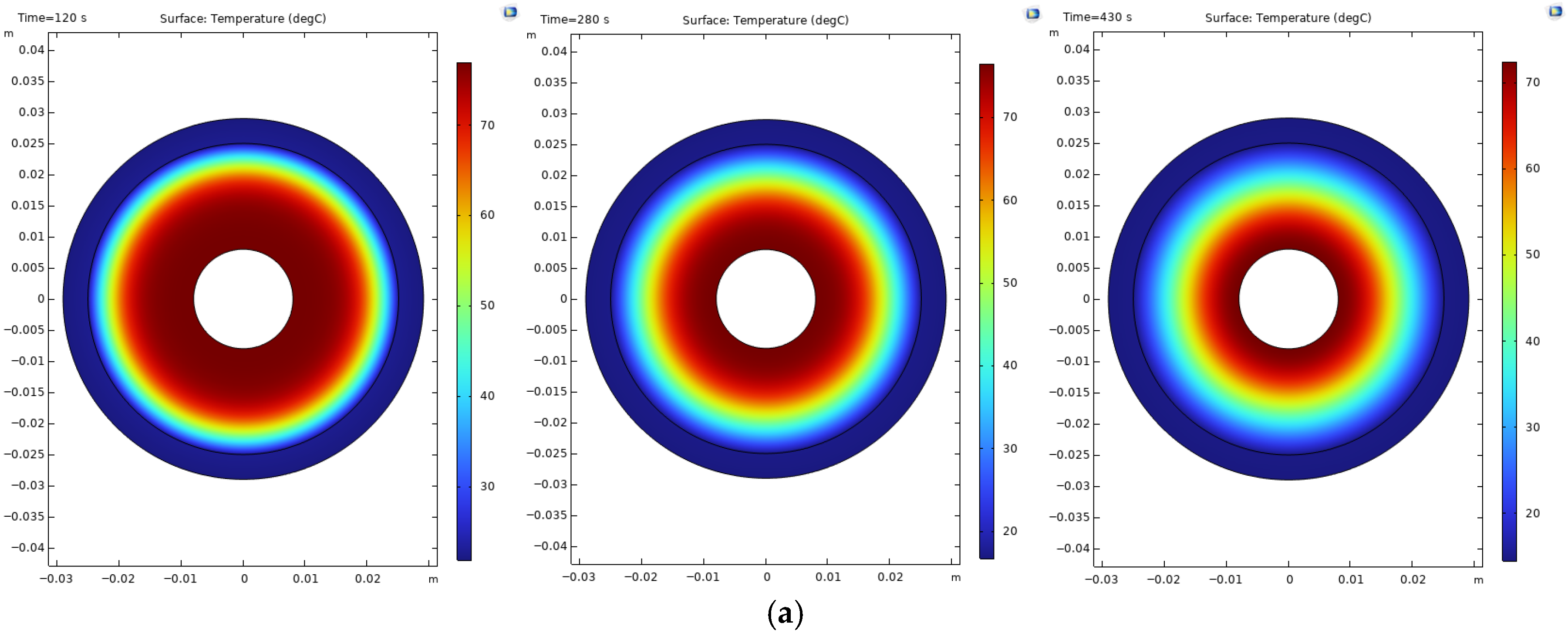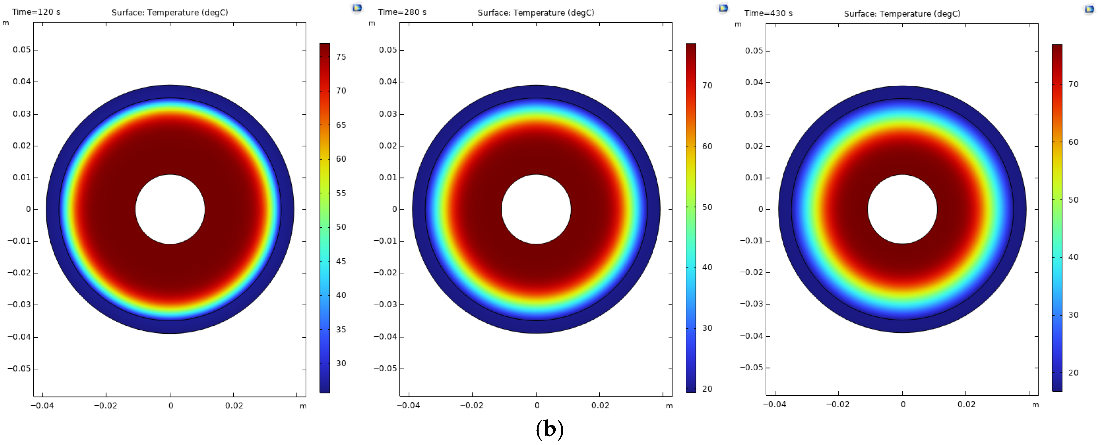 The flow velocity from the first set of simulations was maintained for these simulations (~1.85 m/s). Due to the changing diameter of the cooling tubes, the mass flow rate for each reactor differed, impacting the heat transfer coefficient of the cooling fluid.