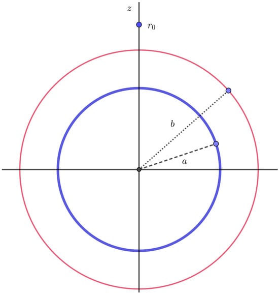 Pyati [] studied the problem of a conducting sphere of radius with a concentric dielectric coating sphere of radius where under the influence of a primary electrostatic field which is due to a unit point charge placed at along the z axis (Figure 7).