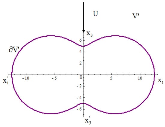 This method has been used by many researchers in order to solve problems in various scientific fields, such as in acoustic scattering by non-convex bodies, where the method was used to calculate the capacity of a class of convex bodies [] and in low-frequency acoustic scattering by a hard scatterer []. Kelvin’s inversion has been applied to solving the external Dirichlet or Neumann problem in a non-convex body [,] using the Fokas method [,], problems in electrostaticity [,,] or in thermoelasticity [], and blood’s plasma flow past a red blood cell [].