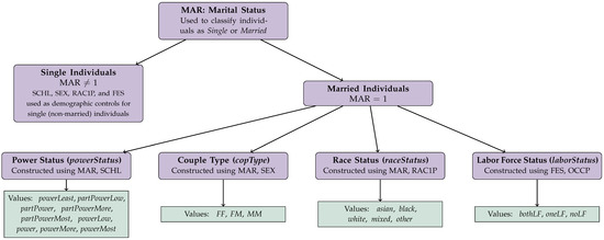 Couple type (copType) is defined using MAR and SEX to distinguish between female–female (FF), female–male (FM), and male–male (MM) pairings. Racial composition is derived from the RAC1P variable for each partner and used to assign couples to the categories white, black, asian, mixed, or other, as described in Table 2. We restrict the number of categories analyzed, particularly for racial composition of the couple, to preserve statistical power and interpretability.