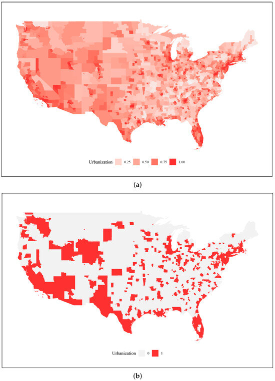 Figure 2a reveals that urbanicity levels vary considerably across the United States, with the most urban areas concentrated along the coasts and in parts of Texas, Florida, and the Great Lakes region. Meanwhile, large portions of the Midwest and Mountain West remain more rural or suburban. By contrast, Figure 2b uses a binary threshold (70% or more urban) and results in a more fragmented representation, highlighting isolated “urban” pockets even in predominantly rural areas. In Figure 2b, a value of 1 denotes an urban area, and 0 denotes a rural area.