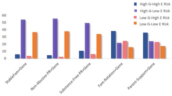 - High G Risk–High E Risk (Lowest-Level Protection): high genetic risk combined with low family protection (e.g., unstable family structure, abusive parenting, parental substance use, poor family relationships, or low parental support).
