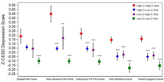 Predicated standardized CES-D (Z-CESD) depression scores by four levels of each gene-family-factor composite measure. They were estimated from results in Supplementary Table S2 for each level of the composite measures. Significance levels are shown for the coefficients of the 3 categories (i.e., high G–low E risk, low G–high E risk, low G–low E risk) compared to the reference category of high G–high E risk (Table 1). *** p < 0.001, ** p < 0.01, * p < 0.05. Abbreviations: G = genetic; E = environmental; StableFm = stable family; Non-Abuse-PR = non-abuse parenting; Substance-FR-PR = substance-free parenting.