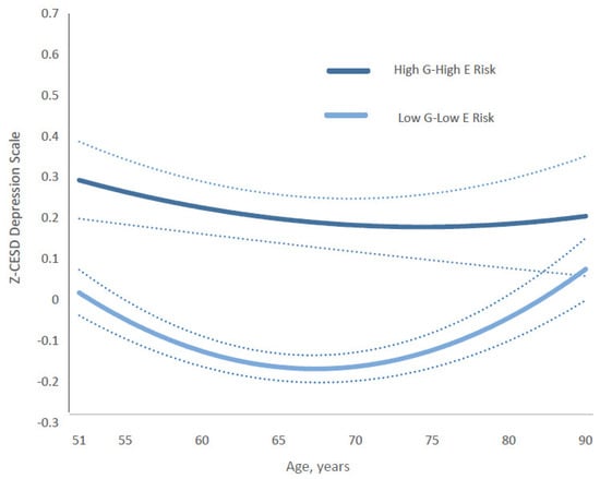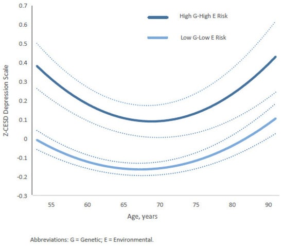 However, we rarely know how early protective family factors intertwine with genetic factors to shape mental health trajectories across the life span from midlife to old age. Which combinations of family and genetic conditions (e.g., low G–low E risk versus high G–high E risk) are more beneficial to mitigate depression over time? Which life stages are more responsive to protective conditions? Although family and twin studies have suggested that environmental processes can outweigh familial heritability [17] for depression outcomes, little research has applied GWAS-based genetic factors to examine how the presence of one conducive condition (either gene or environment) mitigates differently the depression trajectory over time [26,69].