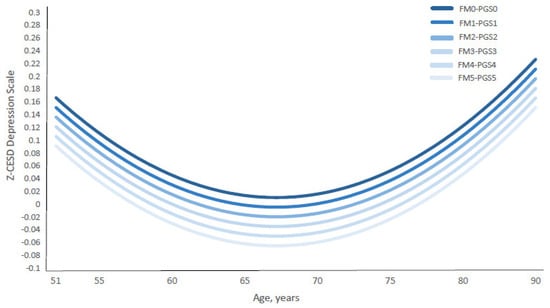 Importantly, the FM5-PGS5 curve shows the lowest depression scores, while the FM0-PGS0 curve presents the highest depression scores. In other words, individuals with high early family protection (FM5) and high genetic risk (PGS5) experienced substantially lower levels of depressive symptoms than those with low genetic risk (PGS0) but who were exposed to adverse family environments (FM0). This pattern suggests that high early family protection (FM5) provides a stronger buffer against depressive symptoms than low genetic risk alone. In practical terms, this means that even among individuals with elevated genetic liability, protective family environments during childhood may confer meaningful reductions in depressive symptoms decades later.