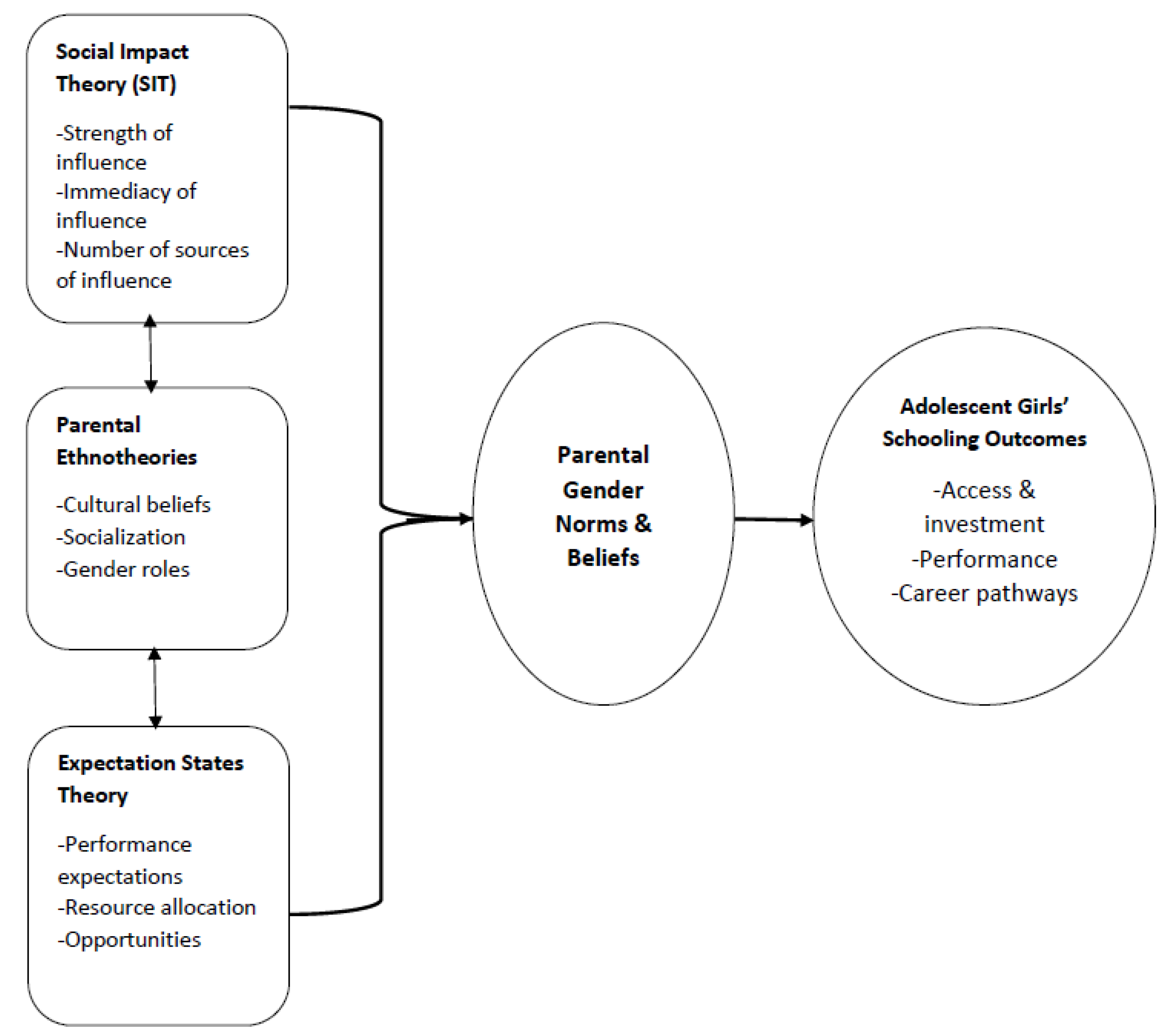 We used Social Impact Theory (SIT), Parental Ethnotheories, and Expectation States Theories as frameworks for understanding how parental gender norms influence adolescent girls’ schooling and education. Latané (1981) defines social impact as any influence on individual feeling, thoughts, or behavior that is exerted by the real, implied, or imagined presence or actions of others [
