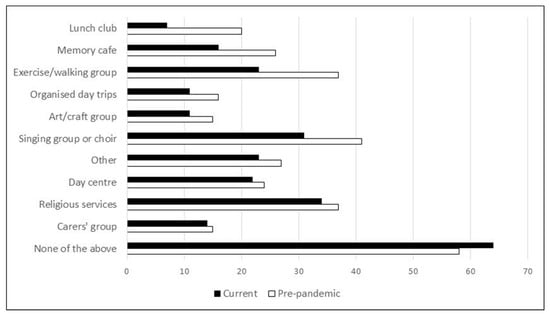Figure 1 shows the difference between the activities undertaken by the person with dementia supported by their carer before and after the pandemic lockdowns in 2020–2021. Asked whether the likelihood of going out to activities had changed for them, 44% of respondents said no. However, 22% said that they were more likely to attend groups—their reasons are given in Figure 2—and 34% said they were less likely to attend groups (Figure 3).