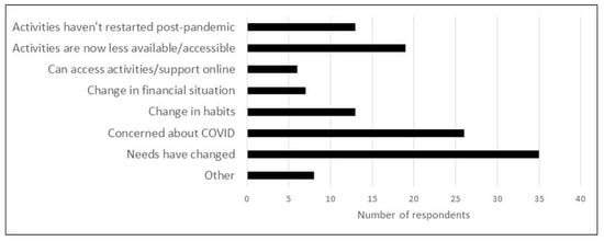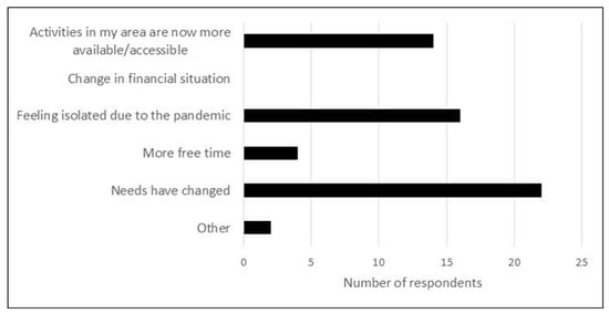 The ‘other’ activities named were: dancing, golf, swimming, gym, educational courses, the Women’s Institute, private daycare, a computer group for older people and football (season ticket holder). The reasons for being more likely to go out are shown in Figure 2 (respondents could give more than one reason). Nobody stated that their financial situation had changed but 22 people (13%) stated that their needs had altered and 16 (9.5%) that they felt isolated due to the pandemic.