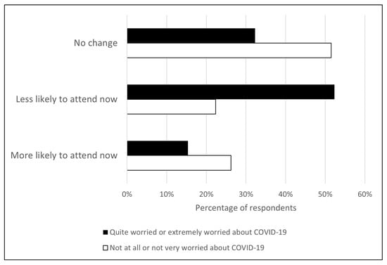 The quantitative data were descriptively analyzed and represented graphically. The qualitative (free-text) data relating to respondents’ willingness to attend face-to-face activities were analyzed using a general inductive approach []. Free-text data were grouped for analysis according to the respondents’ level of concern about COVID-19 (extremely, quite or not at all worried). Each response was also placed in one of three “attitude to risk” categories: avoiding, accepting or dismissing.