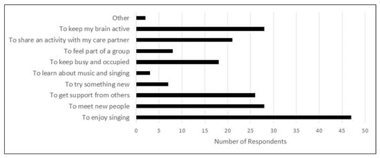 The aim of this survey was to assess the impact of the COVID-19 pandemic on the viability of conducting a feasibility study for a randomized–controlled trial of community singing for people with dementia and their care partners [] by looking at barriers to attendance at groups that might be preventable. We were aware that the context for our planned community-based study had changed significantly due to the impact of COVID-19 on our target population: people with dementia and their carers. We hypothesized a reduced demand for singing activities, either because people altered their habits, or due to ongoing concern about the risk of COVID-19. The survey reported here therefore aimed to gather data on how the attitudes and behavior of people with dementia and their carers towards attending social and leisure activities changed following the COVID-19 pandemic, and gain more specific insight into their attitudes towards attending singing groups.