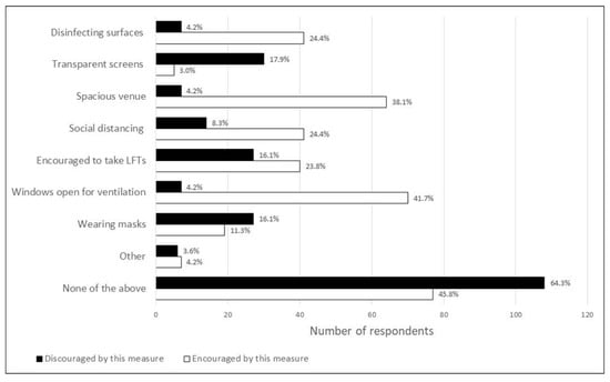The survey asked what could be implemented to make singing groups more or less attractive; responses are shown in Figure 7. Most of the measures were more likely to encourage participants to attend than to discourage them from attending, although the exceptions to this were “Transparent screens between participants” and “Wearing masks when not singing”. However, 64.3% of respondents said that no measures would discourage them from attending, while 45.8% said that no measures would encourage them to attend.