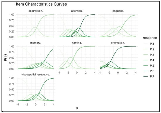 Figure 2 presents Item Characteristic Curves (ICCs) for each MoCA domain, illustrating the relationship between latent cognitive abilities (θ) and response category endorsement probabilities. Steeper curves (e.g., Attention, Naming) indicate higher discrimination, while gradual slopes (e.g., Memory) suggest lower discrimination. Curve positioning along the x-axis reflects domain difficulty, with Orientation being the easiest and Memory the most challenging. These ICCs visually represent how difficulty and discrimination parameters influence response patterns across the cognitive ability spectrum.