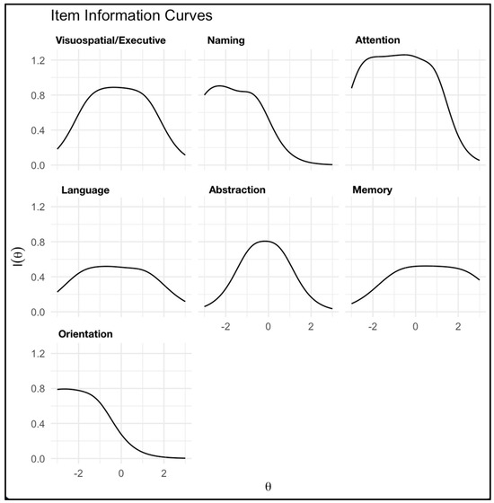 Item information curves for MoCA domains. Legend. This figure illustrates the item information functions (IIFs) associated with the cognitive domains assessed by the Montreal Cognitive Assessment (MoCA). Each graph represents the sensitivity of the respective domain to detect changes in cognitive ability, denoted as theta (θ). The θ parameter is normatively scaled, ranging from −3 to +3, signifying low to high cognitive abilities, respectively. The acme of each curve symbolizes the juncture at which the domain is most informative, i.e., where it most accurately discerns between different levels of cognitive function. A steeper ascent and peak of the curve connote a higher information density, indicating a domain’s heightened precision in measuring cognitive abilities around its peak θ value. Conversely, flattening the curve at the tails suggests diminishing informational yield for extreme ability levels.