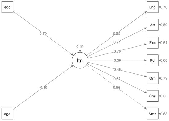 The MIMIC model is a statistical approach that incorporates exogenous variables to assess their influence on latent constructs measured by multiple indicators [29,30]. Its advantages include enhanced flexibility for detecting differential item functioning (DIF) and providing additional insights into the relationships between demographic variables and the test structure: capabilities that may not be captured by traditional factor analysis methods [31,32].