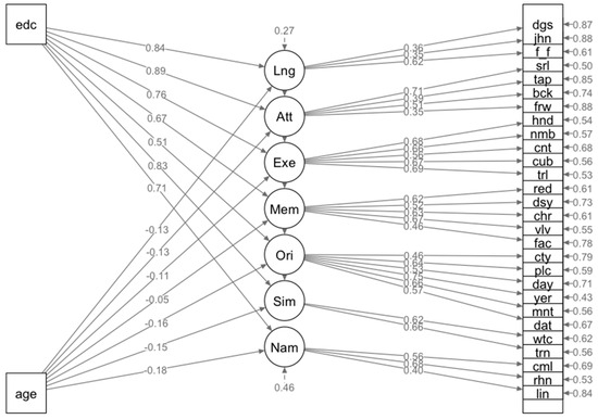 The Multiple Indicators Multiple Causes (MIMIC) model quantifies age and education’s effects on MoCA domains rather than on a single latent trait. Legend. The model provides specific insights into how these variables impact different cognitive domains within the Montreal Cognitive Assessment (MoCA). Rectangles indicate the predictor variables (‘age’ and ‘edc’), and the circles represent the cognitive domains: Language (Lng), Attention (Att), Executive/Visuospatial (Exe), Memory Recall (Mem), Orientation (Ori), Abstraction/Similarities (Sim), and Naming (Nam). The numerical values next to the single-headed arrows from ‘age’ and ‘edc’ denote the strength and direction of the effects on each domain, with negative values indicating an inverse relationship. The right column displays individual MoCA test items with their corresponding factor loadings: dgs (dog sentence repetition), jhn (John sentence repetition), f_f (phonemic fluency), srl (serial 7s subtraction), tap (hand tapping), bck (backwards digit span), fnw (forward digit span), hnd (clock hands placement), nmb (clock numbers placement), cnt (clock contour drawing), cub (cube copying), trl (trail making), red (recall of "red" word), dsv (recall of "daisy" word), chr (recall of "church" word), vlv (recall of "velvet" word), fac (recall of "face" word), cty (naming of city/place), plc (naming of location), day (orientation to weekday), yer (orientation to year), mnt (orientation to month), dat (orientation to date), wtc (similarities between watch and ruler), trn (similarities between train and bicycle), cml (camel naming), rhn (rhinoceros naming), and lin (lion naming).