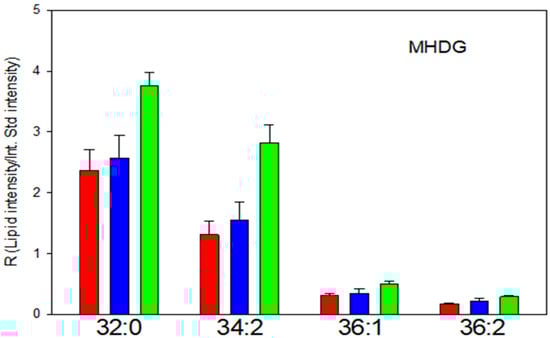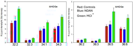 MHDGs were detected at low levels in the cerebral cortex, as reported previously [6,7]. MHDG 32:0 (16:0/16:0) was the predominant MHDG, but the levels of all MGDGs were augmented in MCI subjects (Figure 1, Table 2). The other MHDGs (Table 2) included MHDG 34:2 (16:0/18:2), MHDG 36:1 (18:0/18:1), and MHDG 36:2 (18:0/18:2). No MHDGs with polyunsaturated fatty acid substituents were detected. Of interest was that the levels of MHDGs were not altered in old controls possessing Alzheimer’s neuropathology (NDAN; Figure 1).