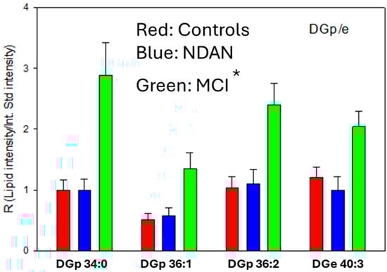 We [1,2,22] and others [3] have reported elevated DGs in the cortex of AD subjects and in MCI [1,2]. However, the ether forms of these glycerolipids have not been investigated. In this context, similar to the MGDG ethers, we monitored increases in cortical DG ethers in the cortex of MCI subjects (Figure 3). In contrast to MGDG ethers, there were more DG plasmalogens (i.e., DGp = alkenyl-acyl DG) than simpler ether forms (i.e., DGe = alkyl-acyl DG). These included DGp 34:0 (18:0p/16:0), DGp 36:1 (18:0p/18:1), DGp 36:2 (18:1p/18:1), and DGe40:3 (20:0p/20:3) (Figure 3; Table 2). None of the DG ethers possessed polyunsaturated fatty acid substituents.