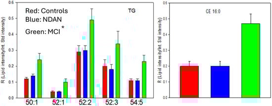 After noting the number of glycerolipid families that were elevated in MCI subjects, we examined TGs and sterol esters (CEs) in lipid droplets, which, along with associated perilipins, have been reported to be increased in AD [23,24]. This investigation revealed increases in a number of TGs and CE 16:0 in the cortex of MCI subjects (Figure 4). The TGs included TG 50:1 (16:0/16:0/18:1), TG 52:1 (16:0/18:0/18:1), TG 52:2 (16:0/18:1/18:1), TG 52:3 (16:0/18:1/18:2), and TG 54:5 (18:2/18:2/18:1 and 16:0/18:1/20:4).