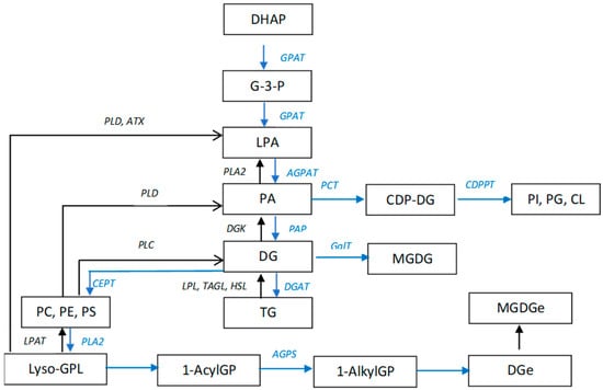 Presentation of glycerolipid pathways. DG and MGDG sources include de novo synthesis of phosphatidic acid and/or metabolism of glycerophospholipids (PC, PE, PS). Similarly, the metabolism of alkyl-acyl glycerophospholipids can generate DGe and MGDGe. 1-AcylGP, 1-acyl-glycereolphosphate; AGPS, alkylglycerolphosphate synthase; 1-AlkylGP, 1-alkyl-glycerolphosphate; AGPAT, acylglycerol-3-phosphate acyltransferase; ATX, autotaxin (lysophospholipase D); CDPPT, CDP-diacylglycerol-inositol/glycerol phosphatidyltransferase; CEPT, choline and ethanolamine phosphotransferases; CL, cardiolipin; DAGL, diacylglycerol lipase; DG, diacylglycerol; DGe, alkyl-acyl glycerol; DGAT, diacylglycerol acyltransferase; DHAP, dihydroxyacetone phosphate; DGK, diacylglycerol kinase; FA, fatty acid; G-3-P, glycerol-3-phosphate; GalT, galactosyltransferase; GPAT, glycerol-3-phosphate acyltransferase; GPL, glycerophospholipid; HSL, hormone-sensitive lipase; LPA, lysophosphatidic acid; LPAT, lysophospholipid acyltransferase; LPL, lipoprotein lipase; MGDG, monogalactosyl-DG; MGDGe, monogalactosyl-alkyl-acyl glycerol; PA, phosphatidic acid; PAP, phosphatidic acid phosphatase; PC, phosphatidylcholines; PE, phosphatidylethanolamine; PG, phosphatidylglycerol; PI, phosphatidylinositol; PLA2, phospholipase A2; PLC, phospholipase C; PLD, phospholipase D; PCT, phosphatidic acid cytidyltransferase; PS, phosphatidylserine; TAG, triacylglycerol; TAGL triacylglycerol lipase.