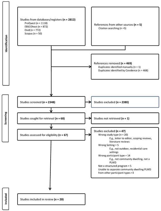 The search strategy was developed in consultation with an experienced research librarian who provided feedback and recommended relevant databases; these comprised general and more discipline-specific databases focused on health; health care; life, medical, psychological and social sciences; education; and the humanities and would provide breadth and comprehensiveness when searching the available evidence. The Ovid® [Allied and Complementary Medicine Database (AMED); Health and Psychosocial Instruments; Ovid Medline®; Ovid Healthstar; Ovid Emcare]; EBSCOhost [Ageline, Cumulative Index to Nursing and Allied Health Literature (CINAHL)]; Scopus; and ProQuest Central (APA PsycInfo®, Applied Social Sciences Index and Abstracts, International Bibliography of the Social Sciences (IBSS), Nursing and Allied Health Premium, Sociology Collection) databases were searched from 1 January 2000 to 30 November 2024. We chose the year 2000 as our search start year to capture the available evidence related to outdoor-based care, a relatively new concept in the literature at the time, and overlapping with the increased interest in non-pharmacological approaches which also began at this time, with both aspects gaining traction in the dementia literature over the past few decades. Broadly, our search terms included the following: dementia, outdoor activities, nature, caregivers/care partners, and community-dwelling (see Table A1 in Appendix A for a sample search query). We also hand-searched [] the reference lists of articles selected for inclusion and recent and relevant scoping and systematic reviews for additional articles.