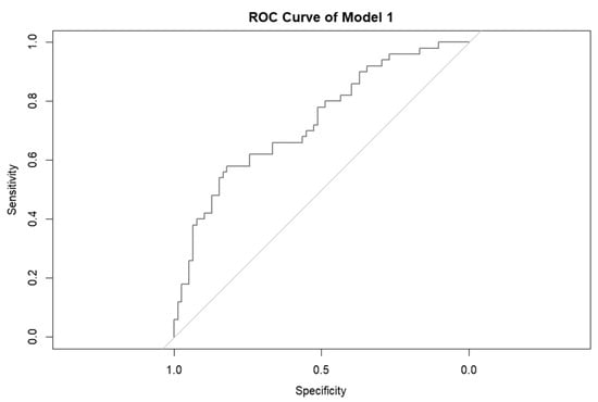 The ROC curve illustrates the trade-off between the true positive rate (sensitivity) and the false positive rate (1-specificity) for Model 1 across different threshold settings. ROC = receiver operating characteristic. Area under the curve = 0.7313.