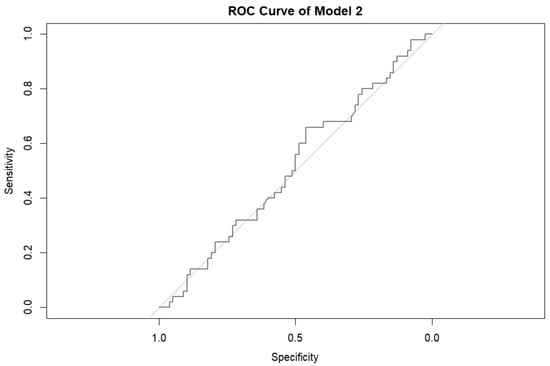 The ROC curve illustrates the trade-off between the true positive rate (sensitivity) and the false positive rate (1-specificity) for Model 1 across different threshold settings. ROC = receiver operating characteristic. Area under the curve = 0.5144.