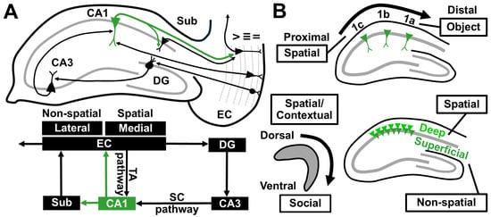- Ito, H.T.; Schuman, E.M. Functional division of hippocampal area CA1 via modulatory gating of entorhinal cortical inputs. Hippocampus 2012, 22, 372–387. [Google Scholar] [CrossRef] [PubMed]