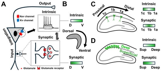 Yet, how these properties can be directly translated to in vivo responses is controversial owing to the striking topographical differences [35]. For example, ventral CA1 PNs form a weaker and less stable synaptic plasticity [36,37], but are also more excitable than dorsal PNs (Figure 2B) [38]. In the dorsal hippocampus, similar synaptic and intrinsic properties are found at CA1a and CA1c PNs whereas CA1b is distinguished by having lower intrinsic excitability with higher synaptic integrating properties (Figure 2C) [35]. Next, synaptic plasticity of CA1 PNs is more robust in the superficial layer [39] whereas deep CA1 PNs elicit higher firing in the dorsal region (Figure 2D) [35]. These findings suggest that these axis-dependent differences may be related to the expression/function of ion channels as well as receptors underlying intrinsic and synaptic properties.