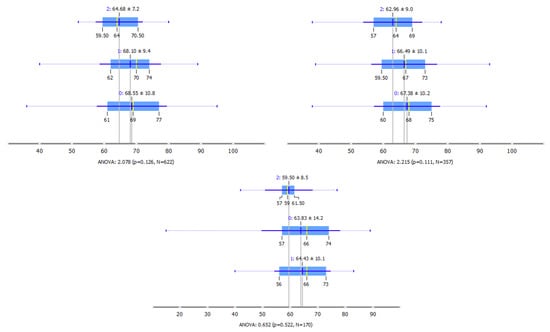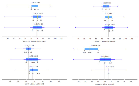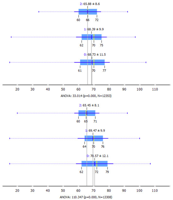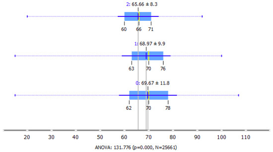 ANOVA of E4 count vs. age of onset. An ANOVA of age at the onset of cognitive impairment by APOE-E4 allele count. Boxplots show the median (yellow line), interquartile range (blue box), and 5th–95th percentile whiskers for E4 counts of 0 (bottom), 1 (middle), and 2 (top). Each group’s mean ± SD is annotated above its box: 69.67 ± 11.8 years (E4 = 0, N = 25,661), 68.97 ± 9.9 years (E4 = 1), and 65.66 ± 8.3 years (E4 = 2). Vertical gray lines mark the overall median, and the ANOVA test (F = 131.776, p < 0.001) confirms a significant dose-dependent decrease in the age of onset with an increasing E4 count.
