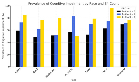 In general, increasing the E4 count was associated with an increased prevalence of cognitive impairment, as Figure 1 shows, and an earlier age of onset of declining cognition; see Figure 2. For this database, evaluations for the effects of race and gender on CI are meaningless since the database does not represent the population as a whole. The prevalence of CI for a given race or gender does not necessarily reflect the population as a whole. The data is heavily skewed with very few Pacific Islanders, American Indians, Others, and Unknowns, not to mention the ambiguity of some of these less-well-represented races. However, with Mendelian randomization, the APOE allele status was used as a population reference. All races showed a higher prevalence of CI with an increase in the E4 count, except Pacific Islanders from the E4 count = 1 to the E4 count = 2, which involved only two subjects (Figure 3). Figure 7 shows that gender did not affect this to a significant degree.