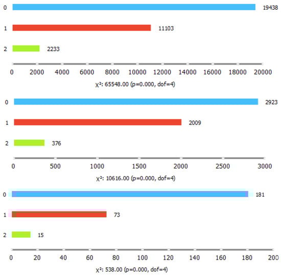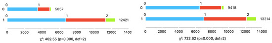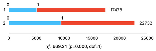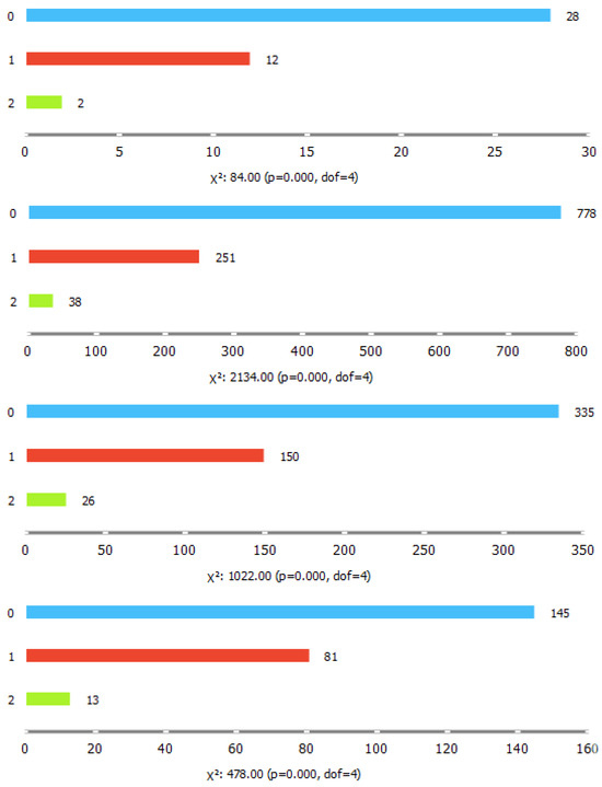 Table 4 shows the results of a logistic regression analysis examining the association between the APOE-E4 allele count and cognitive impairment. A strong, statistically significant relationship was observed (likelihood ratio = 1144.89, p < 0.001). Individuals with one E4 allele had 79% higher odds of cognitive impairment compared to those with no E4 alleles (OR = 1.79, 95% CI: 1.71–1.87, p < 0.001). This association was even stronger for individuals with two E4 alleles, who exhibited nearly four times the odds of cognitive impairment (OR = 3.75, 95% CI: 3.36–4.18, p < 0.001) compared to those with no E4 alleles. The observed dose–response relationship, where risk increases substantially with each additional E4 allele, further provides statistical evidence validating the results that we can see in Chi-square (see Figure 1 and ANOVA analysis (see Figure 2)).