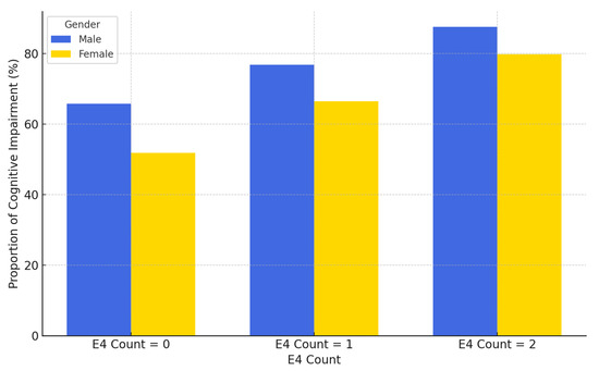 [CI prevalence by E4 count and gender]. Prevalence of cognitive impairment (CI) by APOE-E4 allele count (0, 1, 2) and gender. Blue bars show males, and gold bars show females. In both genders, CI prevalence rises with each additional E4 allele: at E4 = 0, approximately 66 % of males and 52 % of females are impaired; at E4 = 1, about 77 % of males and 67 % of females are impaired; and at E4 = 2, roughly 88 % of males and 80 % of females are impaired. Gender differences are modest at each genotype, indicating a consistent dose-dependent effect of E4 on CI prevalence across sexes.