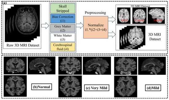 The OASIS database was processed using SPM12 (Statistical Parametric Mapping v.12) software [34], including realignment, co-registration, and spatial and intensity normalization steps. In addition, these images were segmented into Bias Correction, Gray Matter (GM), White Matter (WM), and Cerebrospinal Fluid (CSF) maps. In total, 464 3D MRI images (i.e., size of 91 × 109 × 91 voxels) were preprocessed and normalized according to the intensity range (0, 1). Finally, we synthesized the images into a database for evaluating models. The details of the analysis and synthesis process are given in Figure 1a. Figure 1b–d show examples of 3 different types of patient MRI images after preprocessing with 3 different view modes (i.e., axial, coronal, and sagittal).