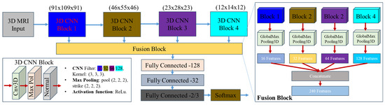 Our proposed model processed 3D MRI images of size (91 × 109 × 91) voxels. Due to the single channel for MRI images, we set the size of the input image to (91 × 109 × 91 × 1). The input images were 3D cubes containing axial, sagittal, and coronal views of the brain. In detail, the proposed model consists of 4 blocks (i.e., Blocks 1 to 4). Each block consists of a 3D CNN layer (i.e., 3 × 3 × 3 kernel), a 3D Maxpooling layer (stride 2 × 2 × 2), and a Normalization layer, and a rectified linear unit (ReLU) activation function was used for all convolutional layers. The outputs of each block were connected to each other by a fusion block. Then, several fully connected (FC) layers were added after the last pooling layer to process the features. The 3D feature map was generated when the result was flattened and concatenated into a 1D vector as input to the FC layer. Finally, a softmax layer was added to the last FC layer and used to predict the class probabilities (i.e., normal, very mild, and mild) while fine-tuning with backpropagation. The model details are depicted in Figure 2 below.