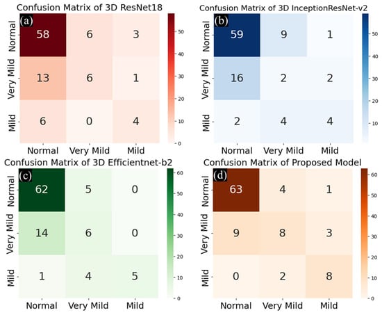 Comparison of confusion matrices for multi-class classification: (a) 3D ResNet-18, (b) 3D InceptionResNet-v2, (c) 3D Efficientnet-b2, (d) proposed model.