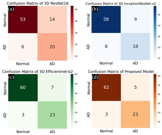 Comparison of confusion matrices for binary classification: (a) 3D ResNet-18, (b) 3D InceptionResNet-v2, (c) 3D Efficientnet-b2, (d) proposed model.