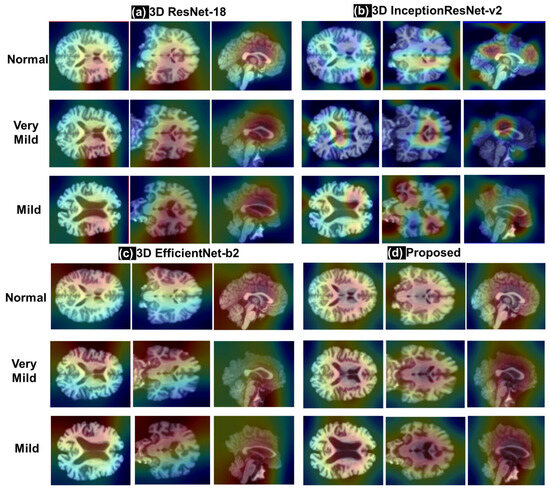 Examples of activation maps with Grad CAM of three different subjects: (a) 3D ResNet-18, (b) 3D EfficientNet-b2, (c) 3D InceptionResNet-v2, (d) proposed model.