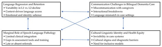 | Cultural–Linguistic Identity and Health Equity Considerations | Motta-Ochoa et al. (2021) [6] | Quebec, Canada–immigrant families | Qualitative ethnographic study | A culturally diverse group of persons with dementia, their caregivers, and staff members (from a non-profit organisation in Canada) | English-French | Language, memory, and identity are deeply intertwined; reverting to L1 was emotionally meaningful. | Care should preserve communicative identity as a human right. | Absence of language-sensitive ethics frameworks. |