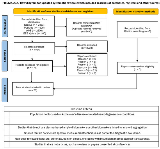 A literature search was conducted in Scopus, PubMed, Web of Science, and IEEE Xplore. The search included studies published from January 2014 to December 2024. The queries were carefully designed to capture all relevant literature and included Boolean operators, synonyms, and Medical Subject Headings (MeSH) terms. To structure the search effectively, we categorized keywords into five thematic groups: (1) Technology: Keywords related to techniques and measurement methods, such as biomarker and fluorescence spectroscopy, were included; (2) Analysis: This category focused on analytical methodologies, including terms like machine learning, data science, and spectral analysis; (3) Field of research: Keywords pertaining to the biological context, such as protein measurements, amyloid aggregates, and A42/40, were prioritized; (4) Zone: This group targeted the measurement medium, using terms such as plasma, blood, CSF; and (5) Exclusion terms: Irrelevant keywords, including terms such as nanoparticles, cancer, and tumor, were excluded to refine the scope of the search and ensure relevance to the research question.