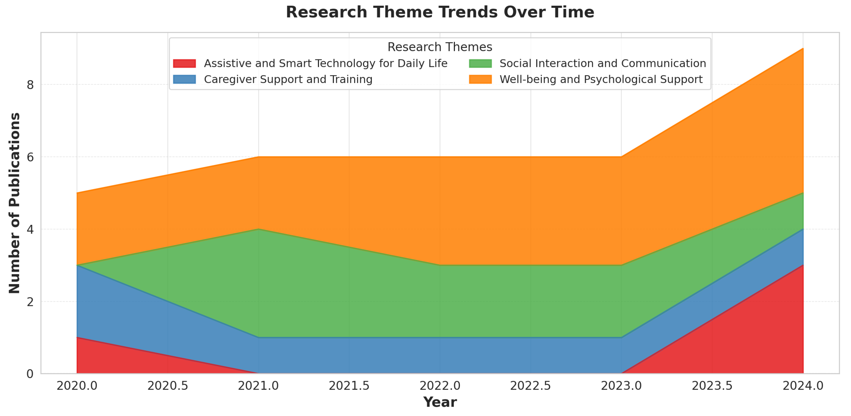 - Analytical coding: Development of higher-order themes such as modes of human–technology interaction, care domains addressed (e.g., cognitive support, safety, caregiver support), reported outcomes (e.g., quality of life, independence, caregiver burden), and cross-cutting considerations (usability, trust, privacy, ethics).