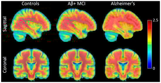 Sagittal and coronal images showing AV-1451 uptake patterns in the brains of normal controls (NCs), Aβ-positive mild cognitive impairment (Aβ+ MCI) patients, and Alzheimer’s disease (AD) patients. The first sites that show accumulation of hyperphosphorylated tau are in the medial temporal lobe for MCI patients. Tau then spreads to more regions and covers parts of the lateral occipital and temporal lobes at the MCI stage. At the overt AD stage, we see high accumulation of tau in areas such as the precuneus and medial prefrontal cortex. Image created using participants from the Alzheimer’s Disease Neuroimaging Initiative (ADNI). The color bar indicates AV1451 uptake (tau deposition), with warmer colors (red) representing higher values of AV1451 uptake and cooler colors (blue) representing lower values. Image created using participants from the Alzheimer’s Disease Neuroimaging Initiative (ADNI database (adni.loni.usc.edu; accessed on 2 June 2025)).