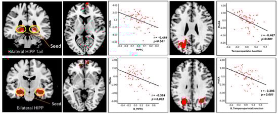 Analysis of FC between hippocampal areas and cortical regions in relation to Montreal Cognitive Assessment (MoCA) scores. Scatter plots illustrate negative correlations between MoCA scores and: the bilateral hippocampal tail (top left; shown in red)—right mPFC (top middle; shown in red) FC, the bilateral hippocampal tail (top left; shown in red)—left temporoparietal junction (TPJ) (top right; shown in red) FC, the bilateral hippocampus (bottom left; shown in red)—bilateral mPFC (bottom middle; shown in red) FC, and the bilateral hippocampus (bottom left; shown in red)—bilateral TPJ (bottom right; shown in red) FC. Adapted from ref. [92]. Licensed under Creative Commons Attribution License (CC BY). Abbreviations: HIPP = hippocampus; mPFC = medial prefrontal cortex; B = bilateral.