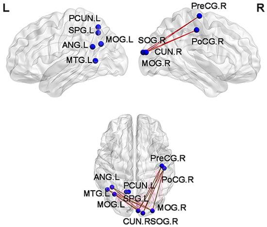 Functional connections with reduced values for subjective cognitive decline (SCD) patients in comparison with normal controls (NCs). Blue spheres mark the brain nodes involved, while red edges visualize the reduced functional connections between them. SPG, superior parietal gyrus; ANG, angular gyrus; MOG, middle occipital gyrus; MTG, middle temporal gyrus; CUN, cuneus; SOG, superior occipital gyrus; PreCG, precentral gyrus; PoCG, postcentral gyrus; PCUN, precuneus; L, left hemisphere of the brain; R, right hemisphere of the brain. Adapted from ref. [98]. Licensed under CC BY 4.0.
