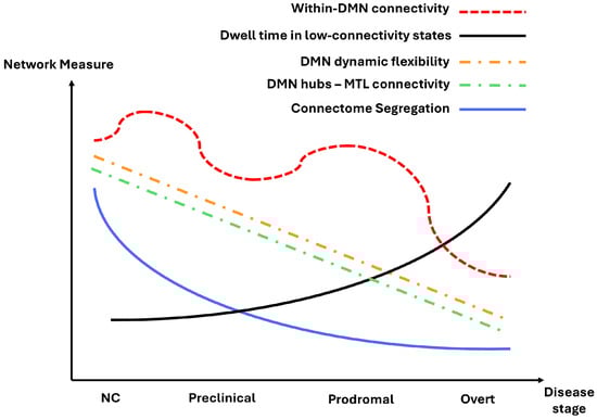 Schematic illustration of a potential evolution pattern of functional connectivity (FC) measures across the Alzheimer’s disease spectrum. Based on consistent findings from our review, we propose that within-DMN connectivity, DMN dynamic flexibility, DMN hubs–MTL connectivity, and connectome segregation gradually decline from normal cognition (NC) to overt stages, while dwell time in low-connectivity states increases. This figure provides a simplified conceptual representation rather than quantitative data, intended to summarize emerging trends observed across studies.