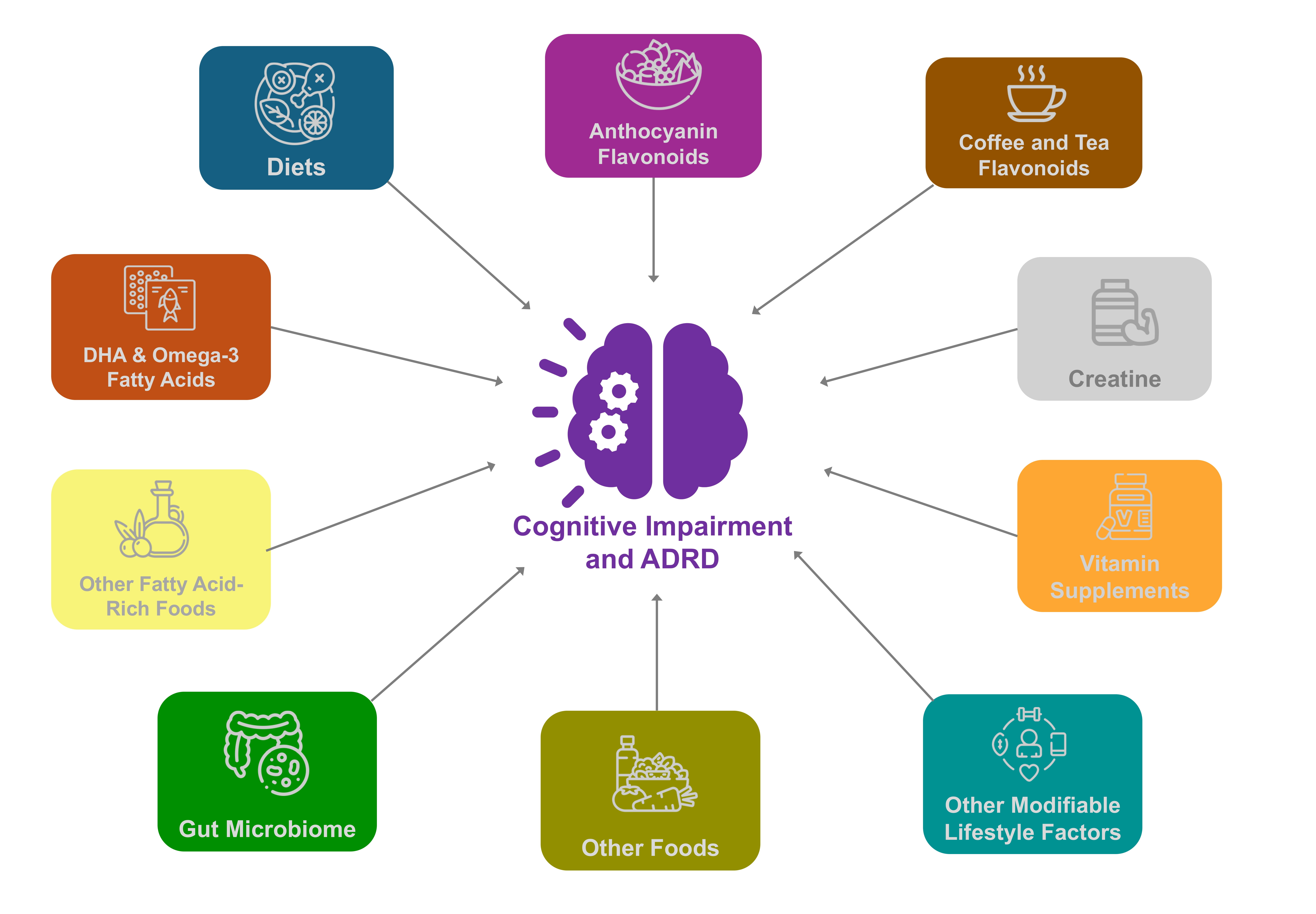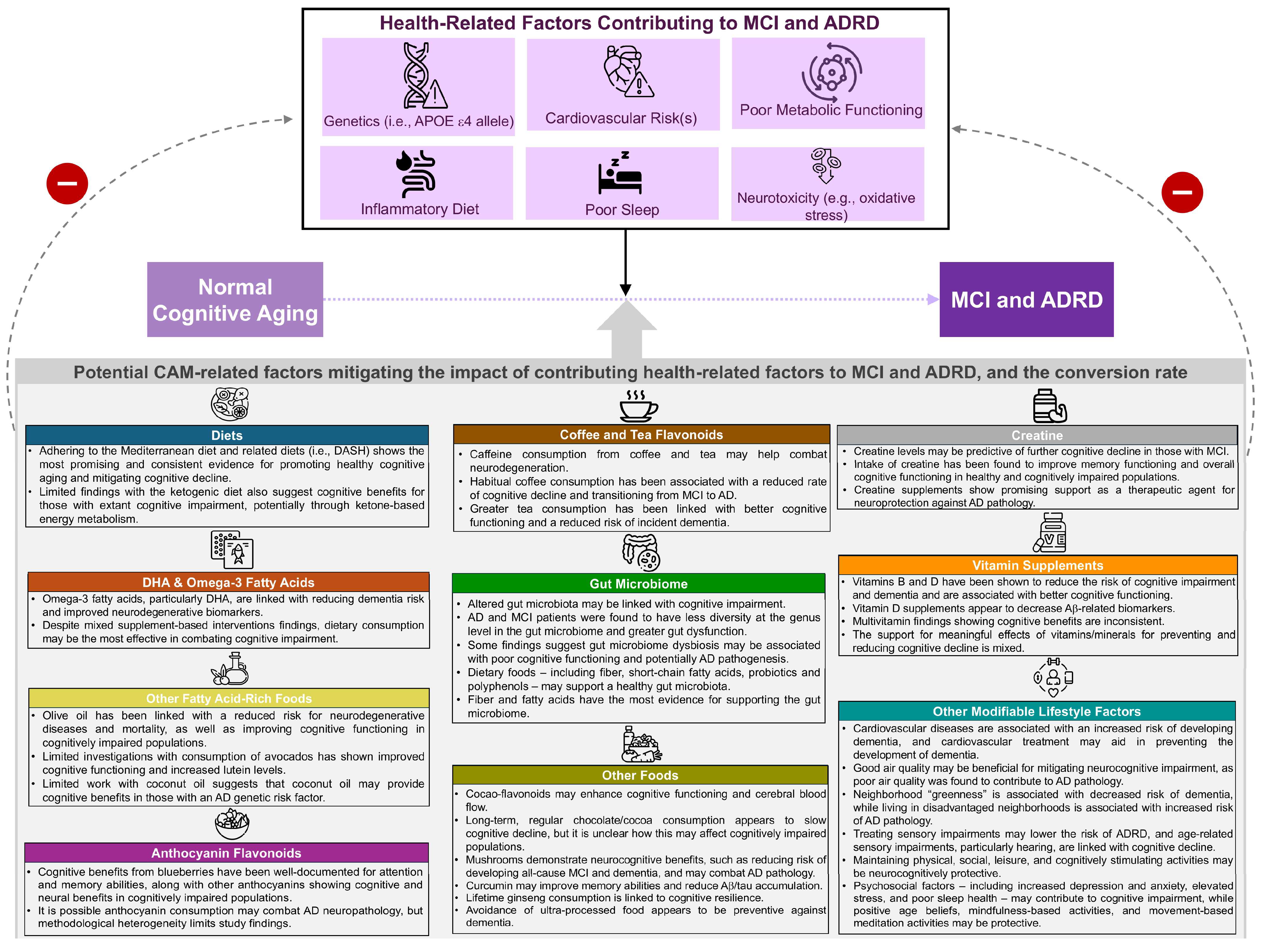 | Dietary Individual Component | Delays MCI Onset [References] | Reduces Risk for AD Dementia/Neurocognitive Decline [References] | Reduces MCI-to-Dementia Conversion [References] | Improves Cognitive Functioning in Dementia Populations [References] | Improves Age-Related Normal Cognitive Functioning [References] | Reduces AD-Related Pathology/ Neurophysiology [References] |